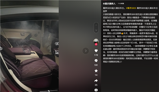 日前有网传视频,一辆尊界S800座舱内后排位置开始冒出浓烟,而后更是燃起明火,还有人举着手机正在拍摄视频。