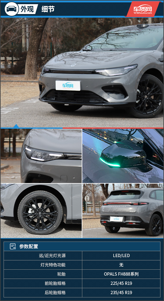 细节方面,评测车还配备了辅助驾驶小蓝灯以及无边框车门,这在同价位中十分少见,可见厂家的诚意。轮毂方面,评测车配备19英寸掠翼运动轮毂,视觉效果出色,与之匹配的轮胎来自OPALS FH888系列,是一款主打运动操控的轮胎,具体规格为前225/45 R19,后235/45 R19。