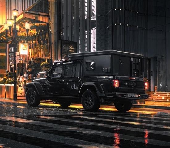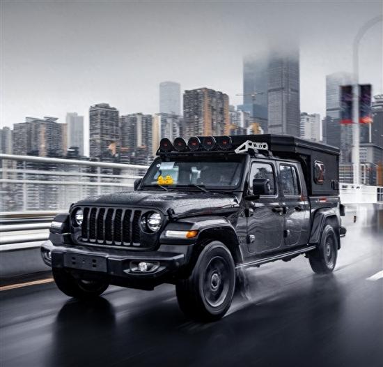 外观方面,新车延续了Jeep家族标志性的硬派设计语言,前脸七孔式进气格栅搭配两侧圆形复古大灯以及粗壮的前后保险,凸显整车越野气息。车身采用双排皮卡造型,平直的车顶线条与贯穿式腰线营造出修长的视觉效果,货箱部分集成原厂旅居套装,配备粗壮行李架及双五辐熏黑轮毂,进一步强化户外属性。