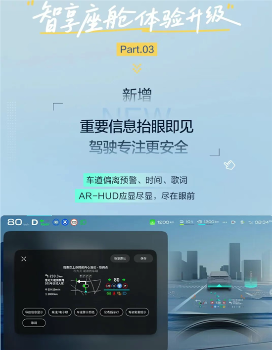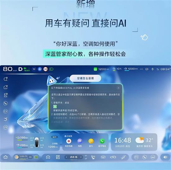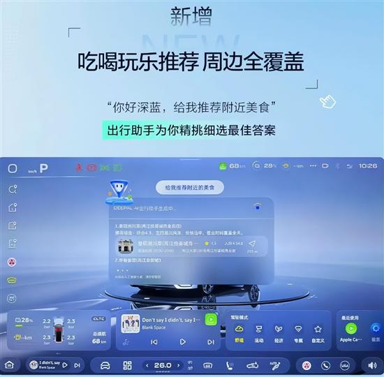 此次升级在智能交互方面亮点突出,新增“直接问AI”功能,用户可通过深蓝管家获取功能操作指导;出行助手新增吃喝玩乐推荐,精准匹配出行需求。界面显示迎来重大优化,支持一屏多用模式,可实现1/3屏导航与2/3屏娱乐系统同屏显示,同时支持个性DIY卡片拖动,车道偏离预警、时间、歌词等重要信息还可在AR-HUD中抬眼可见。
