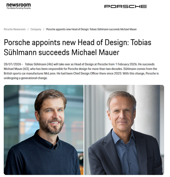 保时捷官方日前宣布,前迈凯伦首席设计官托比亚斯·叙尔曼将于2026年2月1日接替米夏埃尔·莫尔,出任品牌设计负责人,该任命即刻生效。