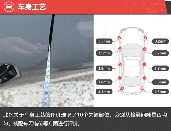 在车身工艺测试环节,整车共选取10个关键部位,每个关键部位都会选取3个关键点进行测量,以评价各关键部位缝隙的均匀程度。从测试结果来看,全车左右两侧的缝隙均值相差不大,但左、右后翼子板与后备箱连接处缝隙均值较高,对最终测试成绩造成一定影响。