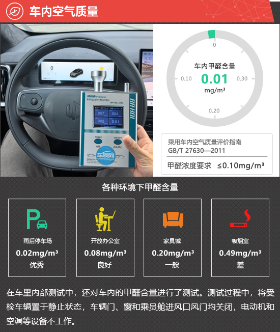 在车内空气质量测试环节,将车辆放置在车辆较少的内部地面停车场中,实测车内甲醛含量为0.01mg/m3,符合2012年3月1日起实施的,由原环保部和国家质量监督检验检疫总局联合发布的《乘用车内空气质量评价指南》(中华人民共和国国家标准GB/T 27630-2011)中的相关标准。