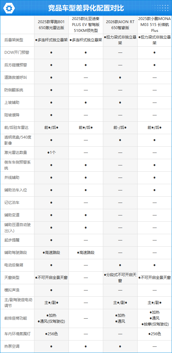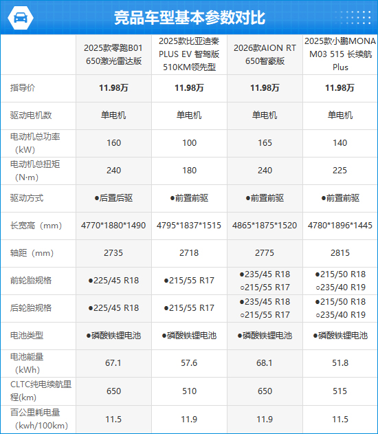对比同价位竞品车型,2025款零跑B01不仅在CLTC纯电续航里程方面表现不俗,其配置表现也要更为出色,独享陡坡缓降、记忆泊车、防侧翻系统,展现出了极强的综合竞争力。此外,其还是本次对比中唯一搭载激光雷达的车型,在辅助驾驶功能方面优势明显。