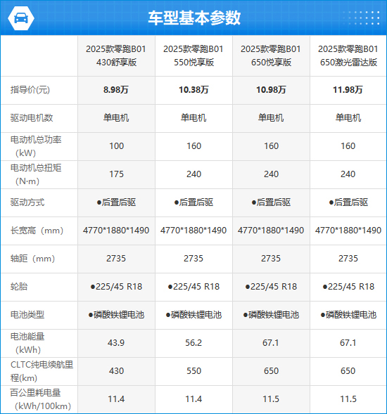 2025款零跑B01全系标配后置单电机,根据配置不同,不仅动力参数有所差异,CLTC纯电续航里程也有430km、550km和650km三种可选。对比来看,入门版车型的配置水平偏低,缺失多项安全和舒适性配置;相比之下,650激光雷达版车型在配置方面表现更优。