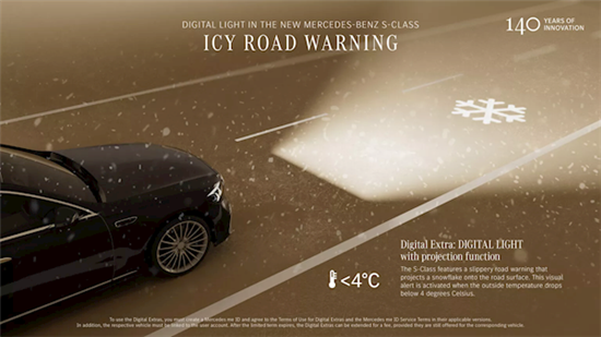 此外,大灯还能向路面投射警示图案,该功能属于奔驰选装的数字增强套件。可投射的内容包括车道偏离提醒、逆行警示,还有全新低温警示标识——路面结冰时,会在车前投射雪花图案。