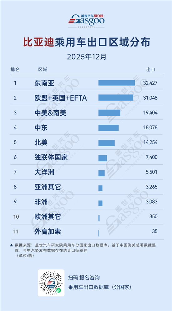 根据盖世汽车研究院出口数据库,2025年12月比亚迪乘用车出口区域排行榜如下: