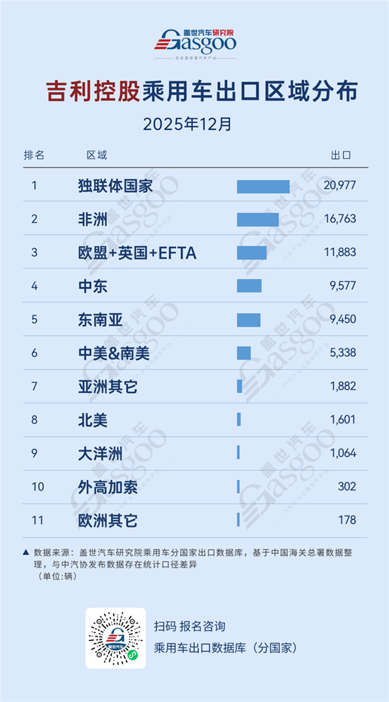 根据盖世汽车研究院出口数据库,2025年12月吉利控股乘用车出口区域排行榜如下: