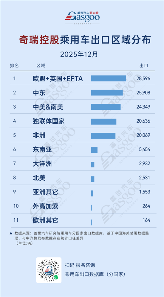 根据盖世汽车研究院出口数据库,2025年12月奇瑞控股乘用车出口区域排行榜如下: