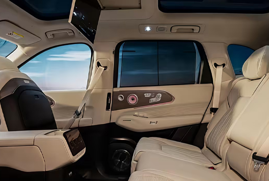 内饰方面,结合此前曝光的图片来看,新车采用由中控屏与副驾娱乐屏组成的一体式连屏设计,并配备怀挡式换挡机构,科技氛围浓厚。T字形中控台区域造型宽厚,功能布局清晰,同时提供扶手、手机无线充电等实用配置。后排方面,新车并未采用极氪9X上可前后移动的后排娱乐屏,而是将其固定在双天窗之间,更偏向于满足后排乘客的基础娱乐需求。