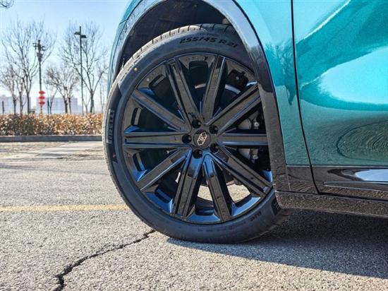 新车将会使用21英寸的黑色多条辐轮毂,同时轮眉和侧护板位置也都是采用了黑色涂装,这也是与整车的风格相搭配。作为一款新能源车型,该车也是配备了隐藏式门把手、无边款车门等配置。