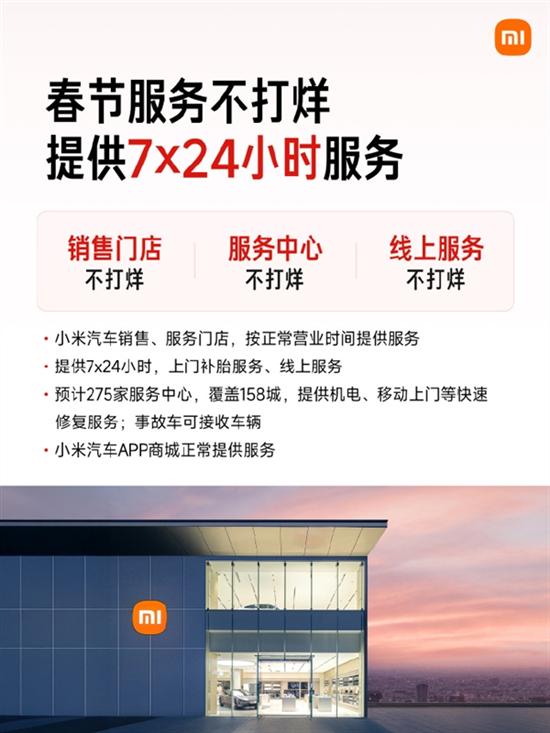 其二为7×24小时上门与线上服务,春节期间小米汽车销售门店、服务中心、线上服务均不打烊,全国预计275家服务中心覆盖158城。
