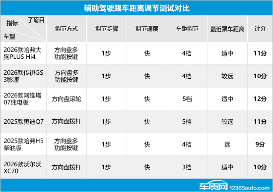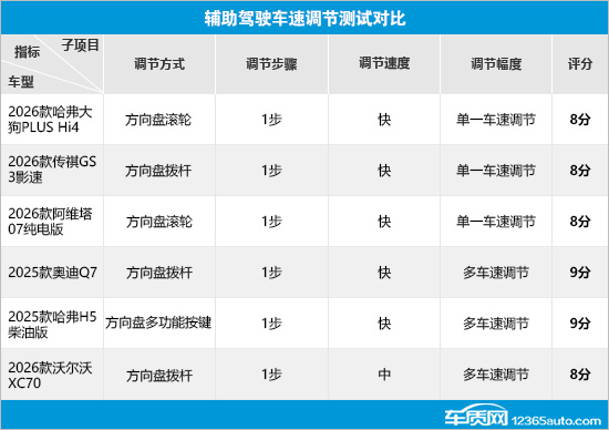 在辅助驾驶车速调节测试对比中,6款车型的整体表现符合预期。虽然调节方式存在差异,但是在调节步骤方面表现一致,调节速度上也仅有沃尔沃XC70稍稍落后。而在调节幅度方面,哈弗大狗PLUS Hi4、2026款传祺GS3影速(以下简称:传祺GS3影速)和阿维塔07纯电版不支持多车速调节,导致出现失分情况。