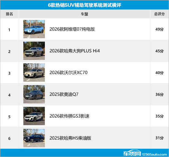通过此次横评可以发现,阿维塔07纯电版以仅失1分的优秀表现排名第一,总评分达到了49分;哈弗大狗PLUS Hi4表现同样不俗,以45分紧随其后;沃尔沃XC70虽然在部分测试环节出现了丢分情况,但整体表现依旧均衡,最终评分仍达到了40分。相比之下,奥迪Q7、传祺GS3影速和哈弗H5柴油版的排名较为靠后,均在辅助驾驶跟车状态测试环节出现了大量失分,哈弗H5柴油版还存在刹停响应速度和舒适度难以令人满意的情况,最终以31分排名垫底。当然,参与横评的6款车型在辅助驾驶系统测试中或多或少都存在一些问题,希望厂家在后续的车型升级中持续优化改进,为车主带来更加安全便捷的辅助驾驶体验。