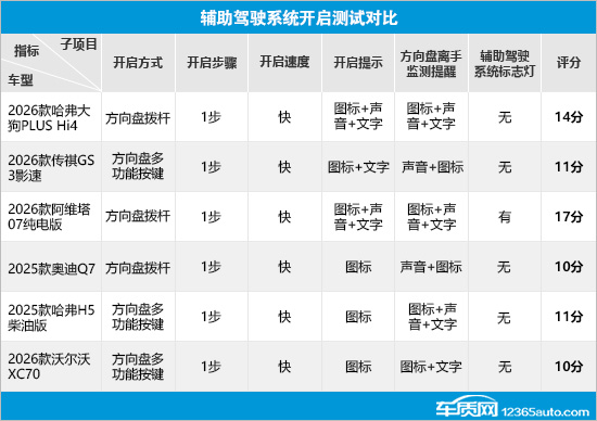 通过横向对比结果来看,2026款哈弗大狗PLUS Hi4(以下简称:哈弗大狗PLUS Hi4)、2026款阿维塔07纯电版(以下简称:阿维塔07纯电版)和2025款奥迪Q7(以下简称:奥迪Q7)采用方向盘拨杆开启,其余车型均采用方向盘多功能按键开启。虽然开启方式有所不同,但所有测试车辆的开启步骤只需要1步,日常使用足够便利。开启提示方面,奥迪Q7、2025款哈弗H5柴油版(以下简称:哈弗H5柴油版)和2026款沃尔沃XC70(以下简称:沃尔沃XC70)仅有图标作为提示,方式较为单一。此外,沃尔沃XC70还是唯一在方向盘离手监测提醒时没有声音提示的车型。辅助驾驶系统标志灯方面,仅阿维塔07纯电版配备了该功能,可给其他道路参与者提供明显的提示。