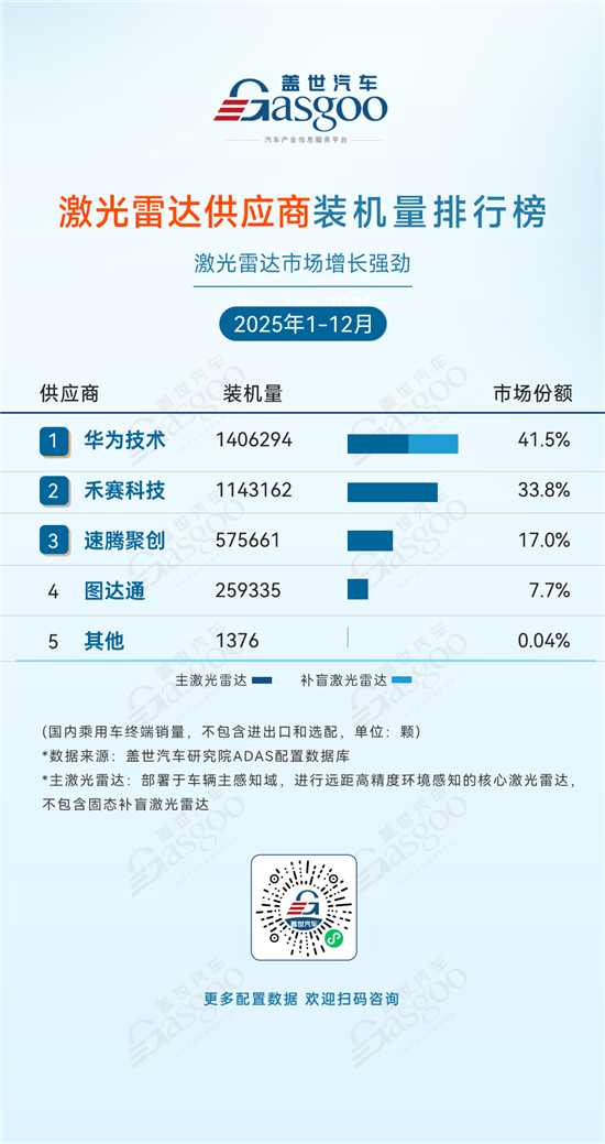 而在2025年1-12月激光雷达供应商装机量排行榜中,华为技术、禾赛科技和速腾聚创三家企业包揽前三名,合计占据了该市场超九成份额。
