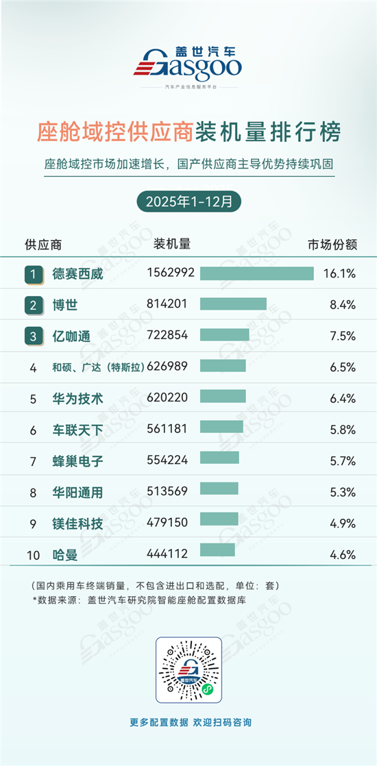德赛西威,2025年1-12月装机量1562992套,市场份额16.1%。