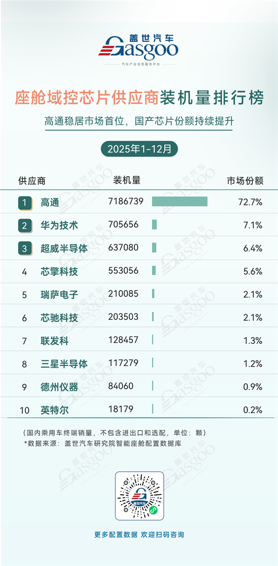 2025年全年,座舱域控芯片市场延续“头部高度集中、国产芯片份额稳步提升”的格局,高通凭借72.7%的市场份额与超718万颗的装机量,稳居第一,其在座舱域控芯片领域的技术成熟度与供应链规模优势依然显著。与此同时,国产芯片阵营的增长动能持续释放:华为技术以7.1%的份额稳居第二,芯擎科技、芯驰科技等本土企业也实现了装机量与市场份额的双提升,充分彰显了国内芯片厂商在车载域控芯片赛道的技术突破与商业化落地能力。