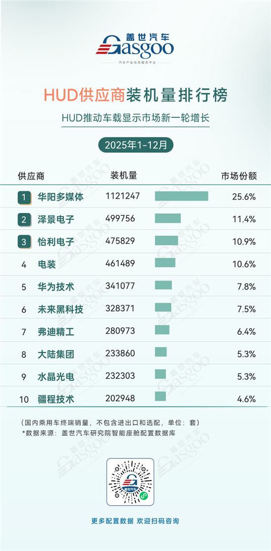 2025年全年,HUD的持续普及正持续推动车载显示赛道扩容,市场呈现出“国产领跑、多元主体竞合”的格局。华阳多媒体以25.6%的市场份额和超112万套的装机量强势领跑,头部优势进一步巩固;泽景电子、怡利电子、电装分别以11.4%、10.9%、10.6%的份额紧随其后,头部阵营内部竞争愈发激烈。华为技术、未来黑科技等企业表现稳健,弗迪精工等国产厂商与大陆集团等传统国际Tier1同台竞技,充分凸显出HUD赛道参与者的多元属性。