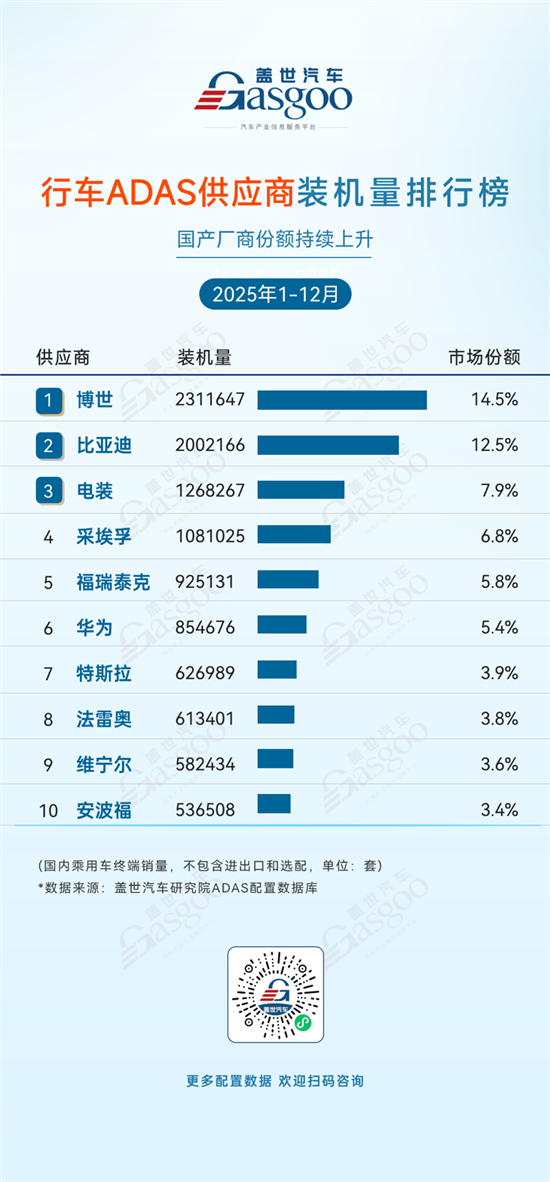 博世,2025年1-12月装机量2,311,647套,市场份额14.5%。