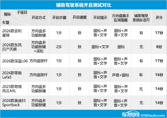 在辅助驾驶系统开启测试对比中,2026款深蓝L06(以下简称:深蓝L06)和2026款零跑Lafa5(以下简称:零跑Lafa5)采用方向盘拨杆开启;2026款东风日产天籁(以下简称:日产天籁)需要方向盘多功能按键配合滚轮才能实现开启;而其余车型均采用方向盘多功能按键开启。开启步骤方面,除日产天籁需要2步外,其余5款车型只需1步。6款车型开启速度都很快,日常使用便捷。开启提示方面,仅日产天籁提供两种提示方式,其余车型为三种提示方式。此外,6款车型均配备方向盘离手监测提醒功能,除了日产天籁仅支持图标提醒,零跑Lafa5支持图标+声音两种提醒方式以外,其余车型都具备三种提醒方式。值得一提的是,2026款吉利星瑞(以下简称:吉利星瑞)、深蓝L06和零跑Lafa5配备了辅助驾驶系统标志灯,能够为其他道路参与者提供明显提示。