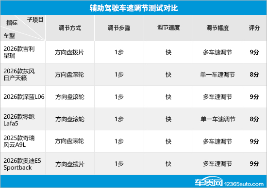 在辅助驾驶车速调节测试对比中,6款车型的整体表现基本符合预期。虽然调节方式存在差异,但调节步骤和调节速度均表现一致。而在调节幅度方面,日产天籁和零跑Lafa5不支持多车速调节,因此出现失分情况。