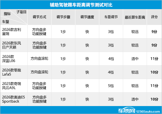 在辅助驾驶跟车距离调节测试对比中,6款车型的调节步骤均为1步,且调节速度表现出色。不过在车距调节方面,2026款奇瑞风云A9L(以下简称:风云A9L)支持5档车距调节;深蓝L06和零跑Lafa5支持4档车距调节;其余车型则表现一般,仅支持3档车距调节。此外,在最近跟车距离方面,深蓝L06和2026款奥迪E5 Sportback(以下简称:奥迪E5 Sportback)体验更好,值得肯定。