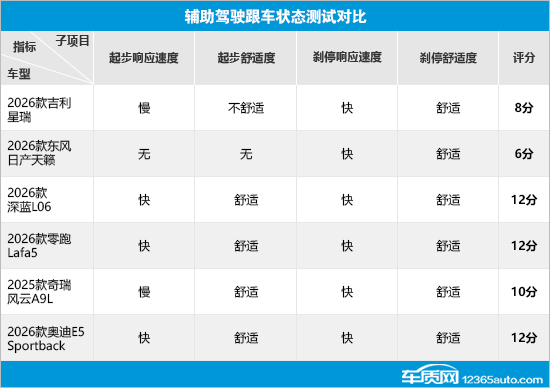 在辅助驾驶跟车状态测试对比中,深蓝L06、零跑Lafa5和奥迪E5 Sportback均获得满分,起步和刹停过程中的响应速度和舒适度都能令人满意。相比之下,吉利星瑞和风云A9L的失分原因在于起步阶段响应速度较慢,前者起步舒适度也有所欠缺。而日产天籁由于不支持自动跟车起步功能,因此在起步响应速度和起步舒适度两项未获得分数。