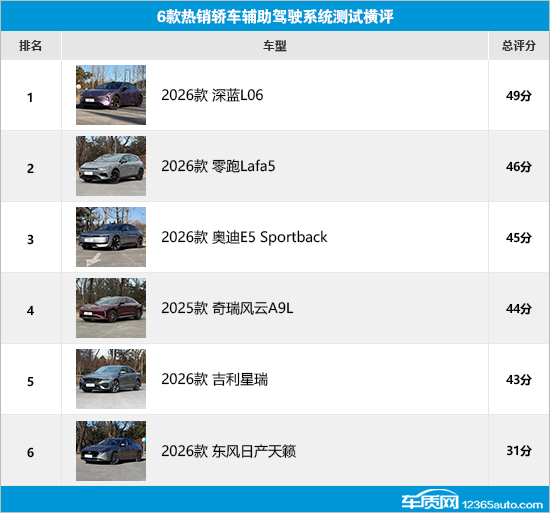 通过此次横评可以发现,深蓝L06凭借辅助驾驶系统开启、辅助驾驶跟车距离调节和辅助驾驶跟车状态测试中的出色表现,总评分达到49分,排名第一;零跑Lafa5表现同样可圈可点,以46分的成绩紧随其后;奥迪E5 Sportback、风云A9L和吉利星瑞虽然分别在不同测试环节存在丢分情况,不过最终评分也都达到40分以上,成绩基本令人满意。至于日产天籁,由于在辅助驾驶系统开启和辅助驾驶跟车状态测试中存在明显减分情况,导致其最终评分仅为31分,排名垫底。当然,参与横评的6款车型在辅助驾驶系统测试中或多或少都存在一些问题,希望厂家在后续的车型升级中持续优化改进,为车主带来更加安全便捷的辅助驾驶体验。