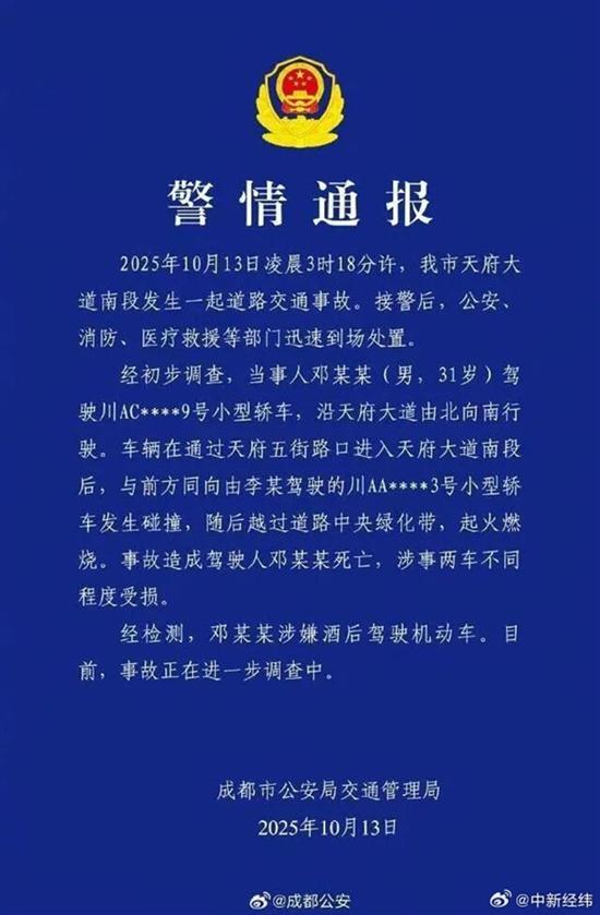 成都市公安局交通管理局2025年10月13日发布通报称,当日凌晨3时18分许,成都市天府大道南段发生一起道路交通事故。