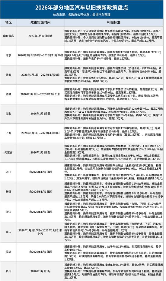 在此背景下,全国各地积极响应国家号召,陆续出台适配本地实际的汽车以旧换新补贴形式各具特色。据盖世汽车不完全统计,截至目前,北京、上海、天津、重庆、西安、贵州等多个省市已相继发布相关补贴政策。以下为各地2026年汽车以旧换新政策详细梳理,供业界参考。