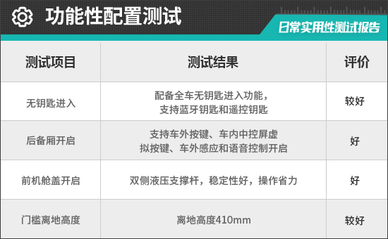 对于消费者来说,门槛离地高度一定程度上决定了上下车便利性。根据实测结果来看,评测车的门槛离地高度为410mm,达到同级别车型中游水平,驾乘人员日常上下车比较便捷。