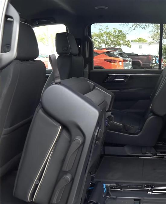 Suburban的第二排座椅不但像普通座椅一样可以前后移动和调节靠背俯仰,还可以通过一个扳手将靠背一键折叠,此时再拉动一个拉带,就能将整个座椅向前翻转,此时形成一个巨大的开口供人进出第三排。同时,在二三排都不坐人的情况下,这里还可以容纳一些较高的大件物品。