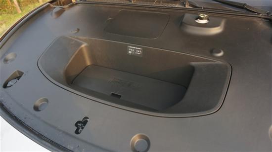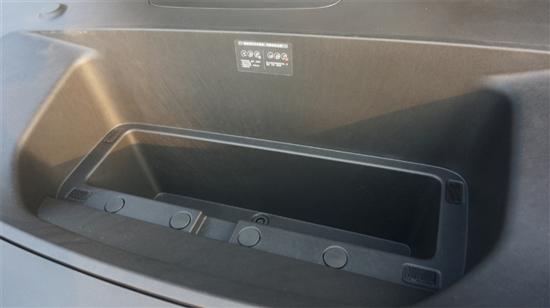 经过三电方面的布置整合之后,P7终于拥有了前备厢。只是56L的容积不算大,位于车头的中央部分,受限于车头长度,个头比较矮的用户拿取物品时会比较吃力。不过里面设计了隔断,拿开之后还隐藏了带有排水孔的下层,适合用来放食物、沙滩玩具等需要和车内其它空间隔开的零碎东西。