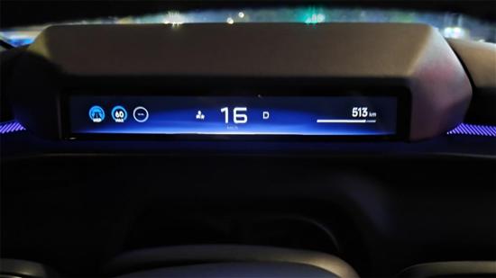 由于HUD的存在,仪表屏得以“优化”成了一个很扁平的样式,有点像领克和小米SU7,只保留了最关键的车速、挡位、续航、智驾状态等信息,以及不同驾驶模式下的背景动效,看起来很有战斗感,而且方向盘再怎么调节也不会被挡住了。