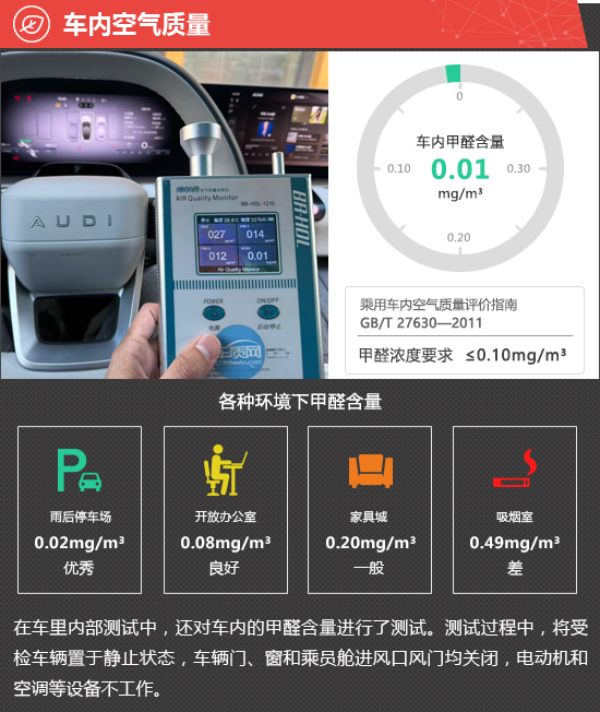 在车内空气质量测试环节,将车辆放置在车辆较少的内部地面停车场中,实测车内甲醛含量为0.01mg/m3,符合2012年3月1日起实施的,由原环保部和国家质量监督检验检疫总局联合发布的《乘用车内空气质量评价指南》(中华人民共和国国家标准GB/T 27630-2011)中的相关标准。