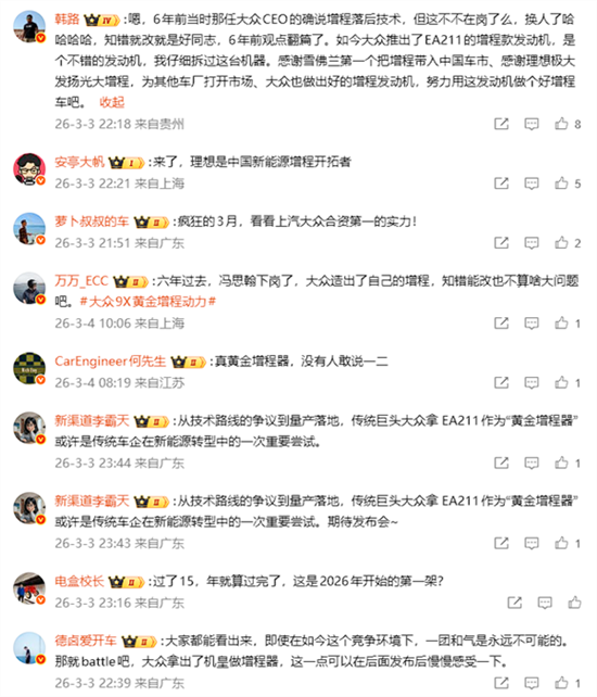 在评论区,不少汽车博主纷纷留言,有人称冯思翰已经下岗,大众造出了自己的增程,知错能改不是什么大问题;还有人盛赞大众EA211是真黄金增程器,没有人敢说一二;更有人帮腔称“这才是行业最强增程,阴阳的酸的在绝对实力面前,通通可以闭嘴,好好看吧!”