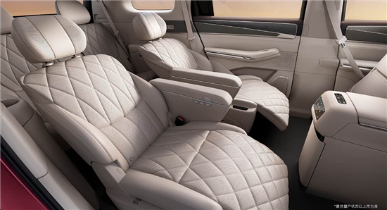 空间部分,第二排配备独立座椅,菱形的缝线高级感十足,座椅支持一键躺平功能。第三排座椅也可以电动调节,并拥有加热功能。配置上,第二排提供大尺寸的折叠屏、车载冰箱和小桌板等。