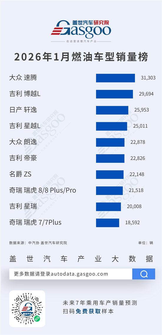 2026年1月燃油车型销量榜中,大众速腾以31,303辆位居首位,吉利博越L以29,694辆排名第二,日产轩逸以25,953辆位列第三;大众朗逸以22,878辆进入前五。整体来看,榜单前列车型销量均保持在2万—3万辆区间,显示出燃油车市场在细分领域仍具备稳定需求。与此同时,吉利星越L(25,011辆)、帝豪(22,826辆)以及星瑞(20,008辆)等车型进入榜单前十,自主品牌在轿车与SUV市场均保持较高活跃度。