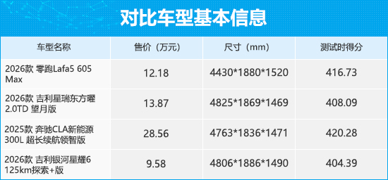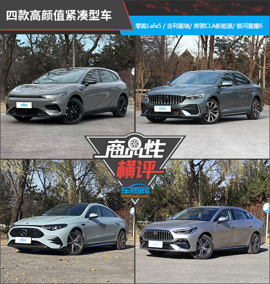 在新能源技术快速迭代的背景下,如今的轿车市场早已打破了传统燃油车一家独大的格局,纯电、燃油、插混等多种动力形式同台竞技,自主与合资品牌也在不同价位区间展开了激烈角逐。在往期的新车商品性评价中,我们曾测试过多款不同定位的轿车产品。今天我们从中挑选了四款高颜值的紧凑型车,它们分别是零跑Lafa5、吉利星瑞东方曜、奔驰CLA新能源以及吉利银河星耀6。本文将通过各项测试数据对比,看看四款车型在商品性方面的表现如何。