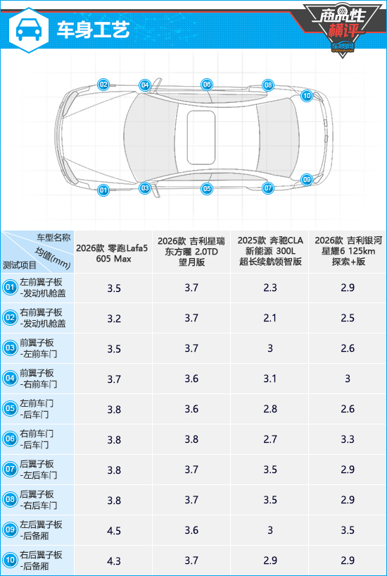 在漆膜水平测试对比环节,需要指出的是,由于零跑Lafa5的后备厢盖和奔驰CLA新能源的车顶均采用非金属材质打造,因此未测得有效数据。