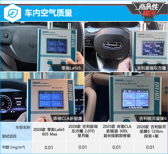 在车内空气质量测试对比环节,四款车型的车内甲醛含量均为0.01mg/m3,符合2012年3月1日起实施的,由原环保部和国家质量监督检验检疫总局联合发布的《乘用车内空气质量评价指南》(中华人民共和国国家标准GB/T 27630-2011)中的相关标准。