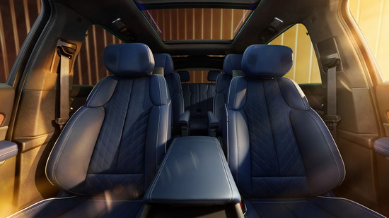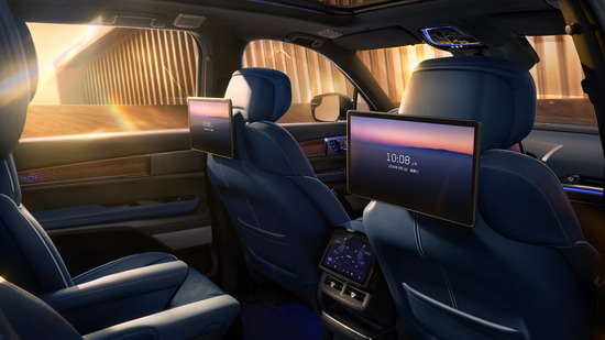 新车二排配备带中央通道区域的8英寸功能控制屏,座椅后方也提供单独的娱乐屏,并支持爱奇艺、QQ音乐等丰富的应用生态。座椅为2+2+2式三排6座布局,前排座椅配备加热、通风和按摩功能,还有五区空调控制系统,后备厢最大容积2271L。车辆座椅延续了美式大沙发的设计质感,中部为皮质纹理缝线,两侧配备宽大的肩部与腰部支撑。同时,贯穿座椅四周的白色缝线可以说是进一步诠释了美式豪华。