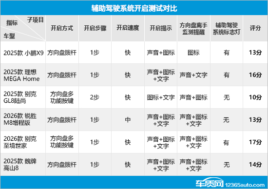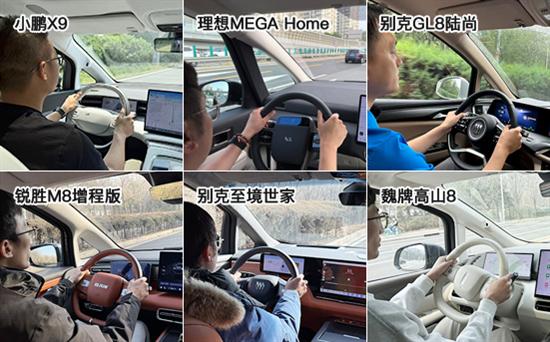 在辅助驾驶系统开启测试对比中,2025款小鹏X9(以下简称:小鹏X9)、2025款理想MEGA Home(以下简称:理想MEGA Home)、2026款锐胜M8增程版(以下简称:锐胜M8增程版)以及2025款魏牌高山8(以下简称:魏牌高山8)均采用方向盘拨杆开启,另外2款车型则采用方向盘多功能按键开启。开启步骤方面,除2025款别克GL8陆尚(以下简称:别克GL8陆尚)需要2步开启外,其余5款车型只需1步,其中锐胜M8增程版的开启速度略逊色于另外5款车型。开启提示方面,理想MEGA Home、锐胜M8增程版、2026款别克至境世家(以下简称:别克至境世家)以及魏牌高山8均提供三种提示方式,其余车型提供两种提示方式。此外,6款车型均配备方向盘离手监测提醒功能,除小鹏X9仅支持图标提醒外,其余车型都具备两种或两种以上的提醒方式。值得一提的是,小鹏X9、理想MEGA Home以及别克至境世家还配备了辅助驾驶系统标志灯,能够为其他道路参与者提供明显提示。