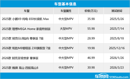 本期选取的6款车型包括5款中大型MPV和1款大型MPV,涵盖自主、合资品牌,并且均为新能源车型。