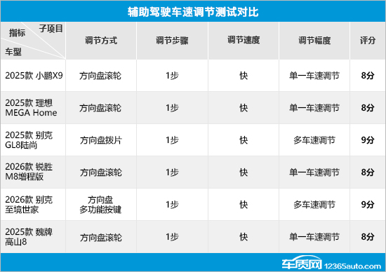 在辅助驾驶车速调节测试对比中,6款车型的整体表现基本符合预期。虽然调节方式存在差异,但在调节步骤方面表现一致,均只需1步,同时调节速度也都足够快。而在调节幅度方面,小鹏X9、理想MEGA Home、锐胜M8增程版以及魏牌高山8不支持多车速调节,因此出现失分情况。