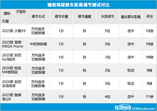在辅助驾驶跟车距离调节测试对比中,小鹏X9以满分成绩领跑,其不仅支持5档车距调节,并且最近跟车距离适中,整体表现出色。理想MEGA Home、别克GL8陆尚以及魏牌高山8虽然最近跟车距离适中,不过由于车距调节档位相对较少,导致出现不同程度失分。相比之下,锐胜M8增程版和别克至境世家表现相对较差,只支持3档车距调节,并且最近跟车距离较远,在该项测试中排名垫底。