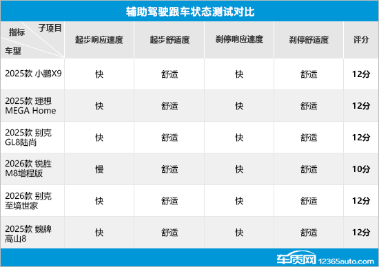 在辅助驾驶跟车状态测试对比中,除锐胜M8增程版外,其余车型均获得满分,起步和刹停过程中的响应速度和舒适度都能令人满意。锐胜M8增程版由于起步响应速度慢,导致其存在失分情况。