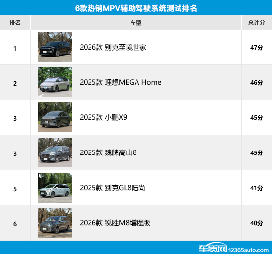 通过此次横评可以发现,别克至境世家在多项测试中获得满分,总评分达到47分,在6款车型中排名第一。理想MEGA Home凭借相对均衡的表现,以46分的成绩排名第二。小鹏X9和魏牌高山8表现同样可圈可点,最终并列排名第三。别克GL8陆尚和锐胜M8增程版虽然在部分测试环节存在丢分情况,不过两款车型的评分也分别达到41分和40分,成绩基本令人满意。当然,参与横评的6款车型在辅助驾驶系统测试中或多或少都存在一些问题,希望厂家在后续的车型升级中持续优化改进,为车主带来更加安全便捷的辅助驾驶体验。