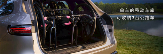 后备箱内预留了10处螺纹点位,可以装拓展配件,秒变露营车,甚至能竖着放三台公路自行车。